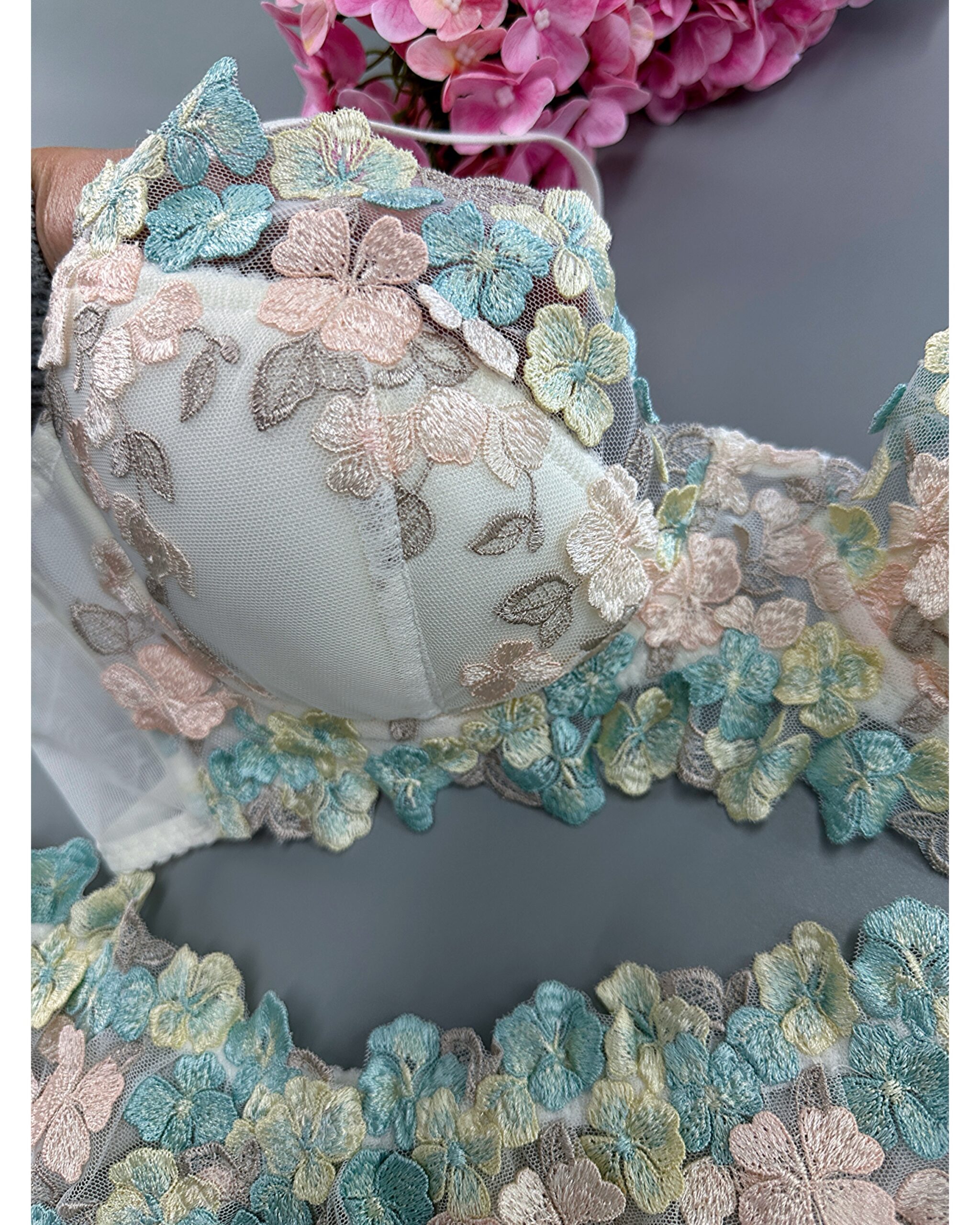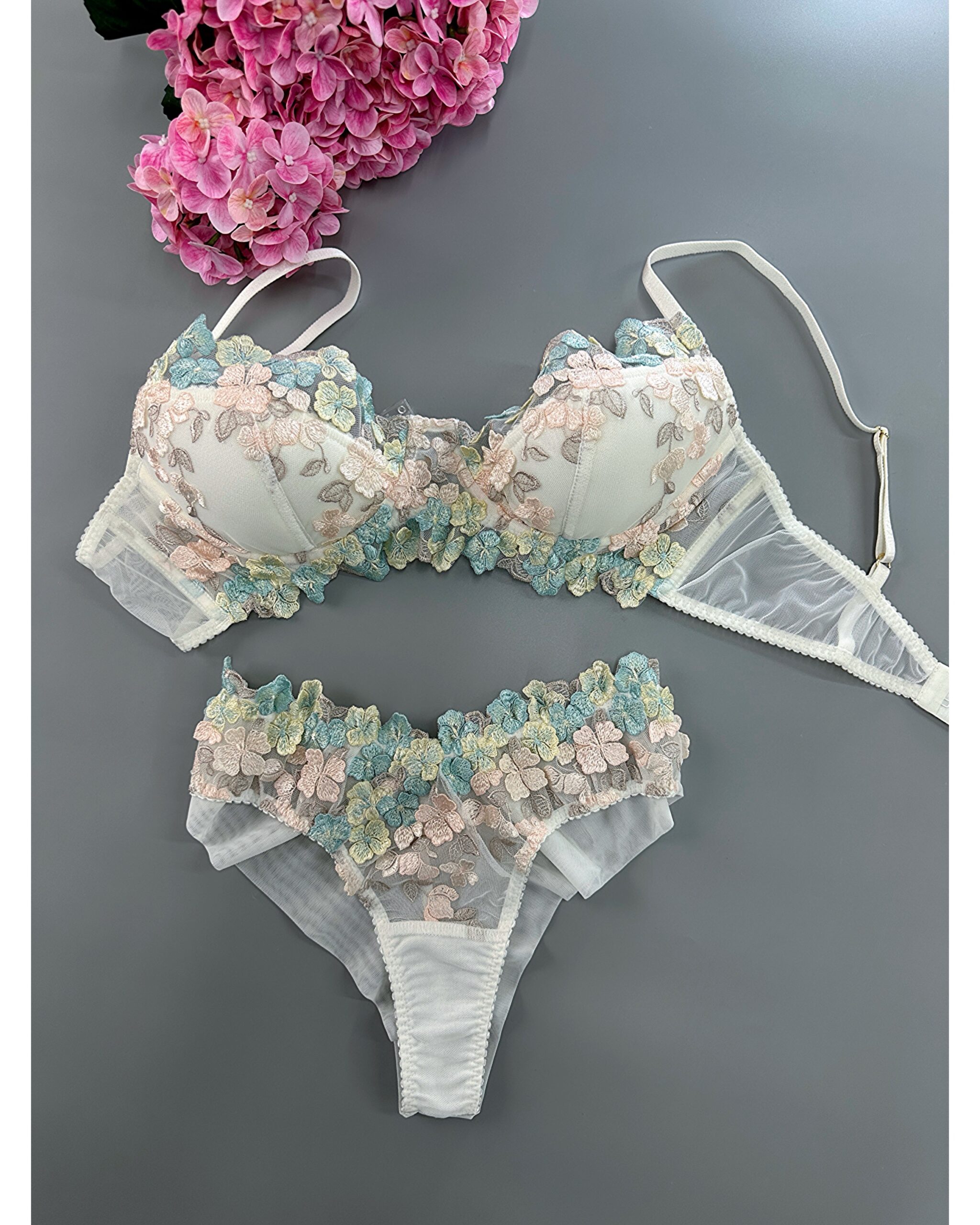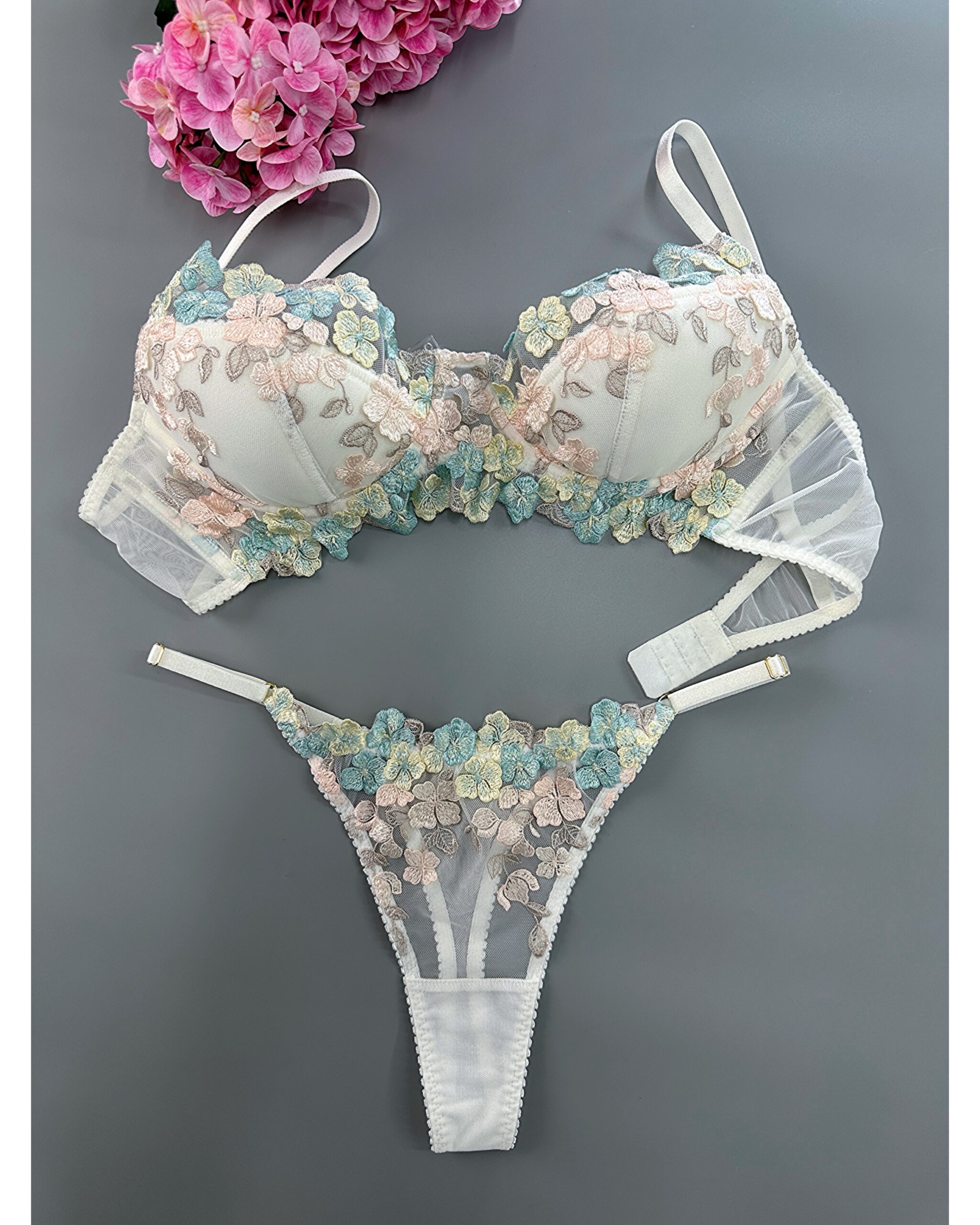 Цей чарівний комплект нижньої білизни в квіточку створений, щоб надати вам почуття весняного настрою. Весь комплект виконаний з якісного матеріалу, чашка із поролону з бавовною.