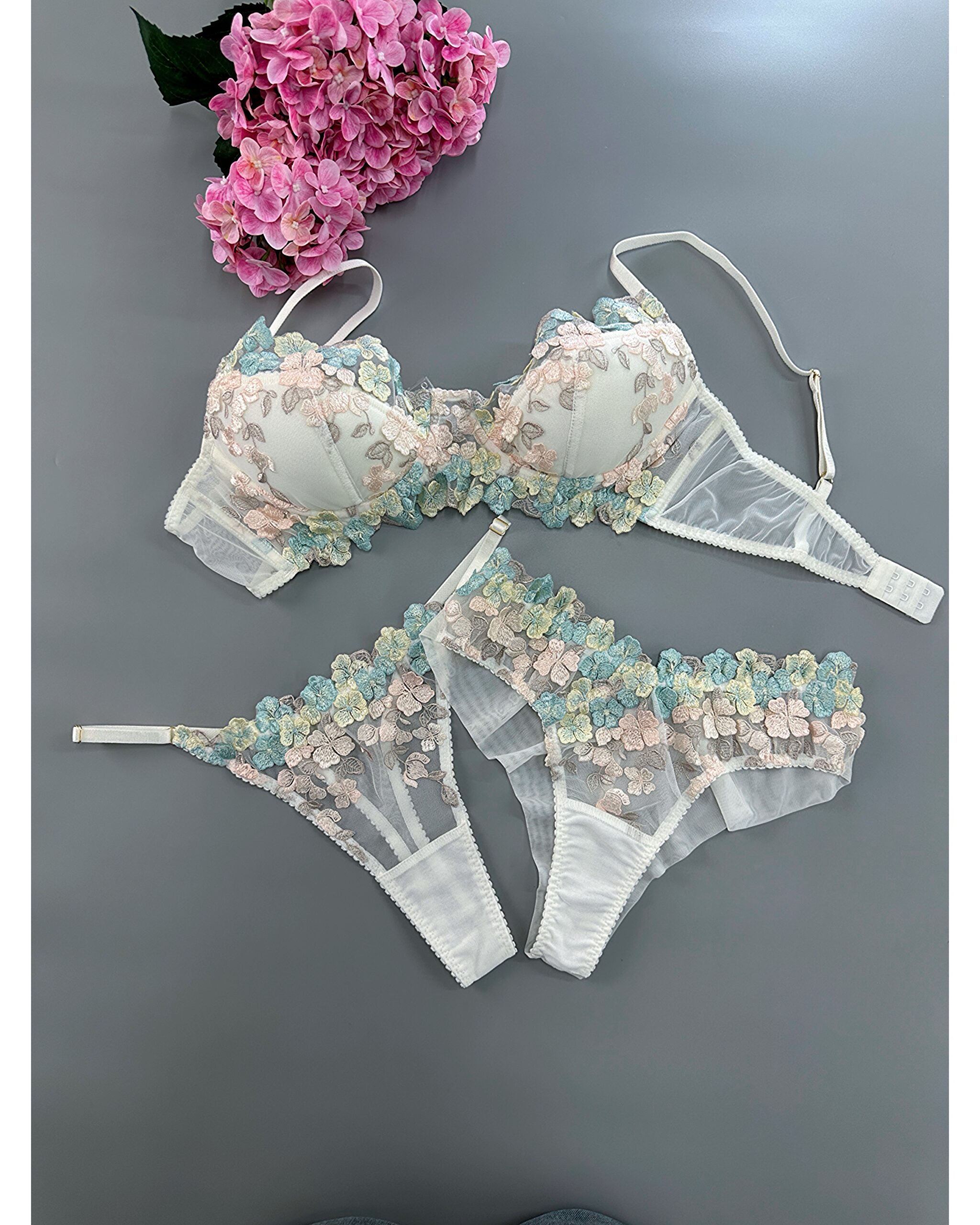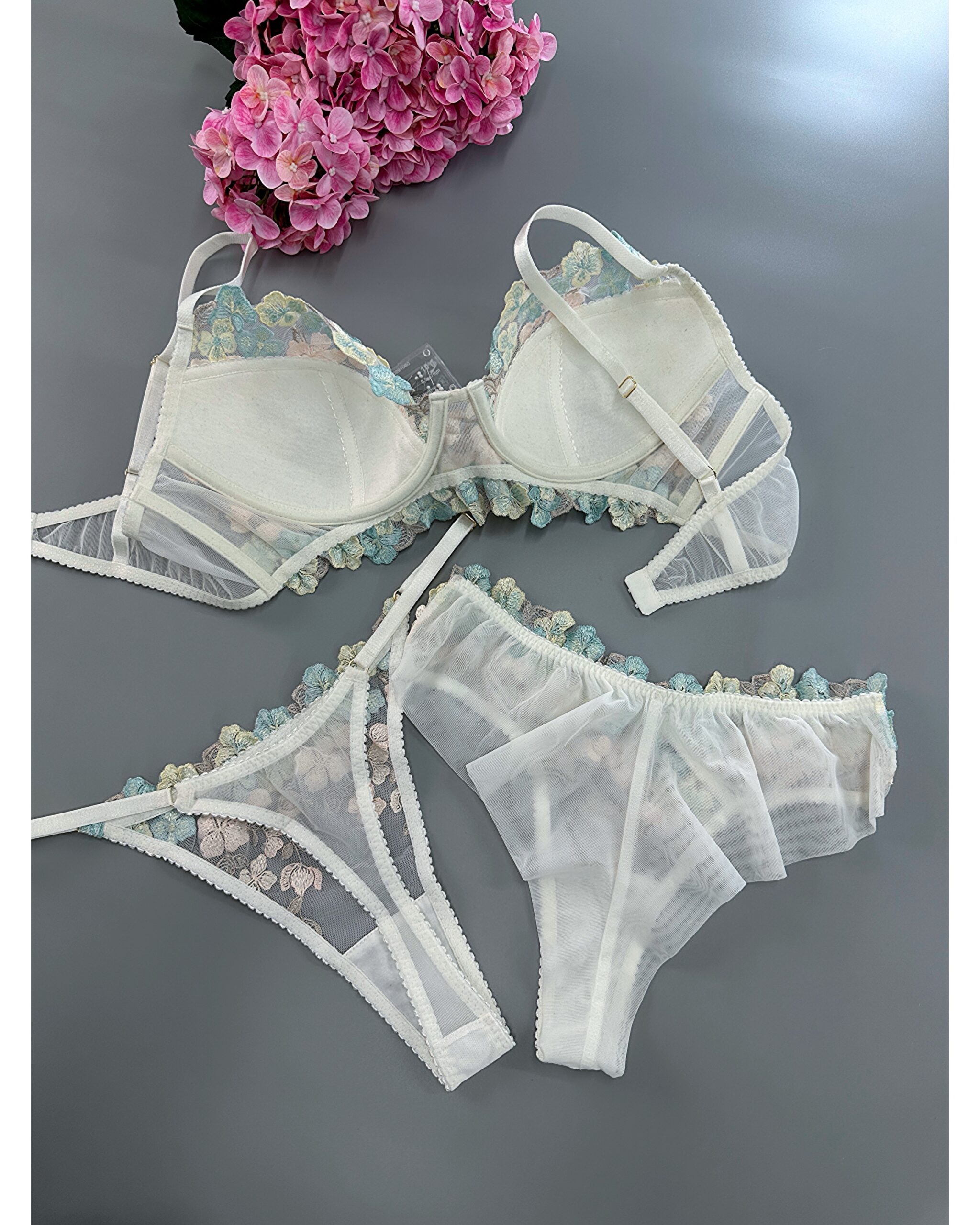 1 review for Мереживний комплект з вишитими квітами і з чашками із поролону + 2 вида трусиків – бразиліано і стрінги