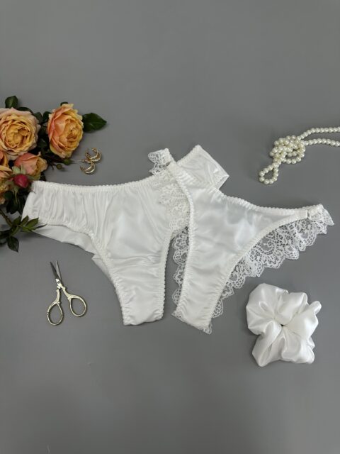 Ніжна і сексуальна, комфорт і відвертість – це все в цьому комплекті спідної білизни! Мереживо м’яке, білосніжне. Регулювання на бюсгалтері і трусиках, що дає змогу підлаштувати комплект під вашу фігуру. До комплекту також входить класичні білі шовкові бразиліано.